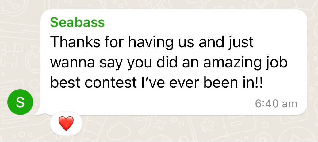 Best comp, so professional; Cheers Theo, Snapper and all involved!
